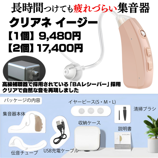 ねこねこ堂元の価格 ¥9,480 - 元の価格 ¥17,400元の価格¥9,480 - ¥17,400¥9,480 - ¥17,400現在の価格 ¥9,480 (税込)| /在庫あり常温 商品紹介映像 商品名 集音器 クリアネ イージー【1個/2個】 こだわりポイント お耳「ふんわり」世代へオススメですイージー操作の集音器 製品情報 世界的に普及する軽度難聴をサポートする「集音器」耳穴を塞がない快適イヤーキャップ...